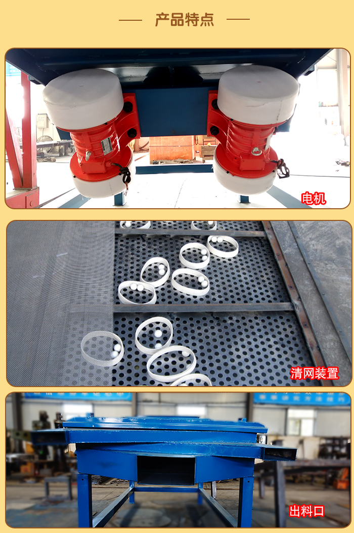 適用于粒度在0.074—5mm,含水量小于7%,無粘性的各種干式粉狀或顆粒狀物料的篩分