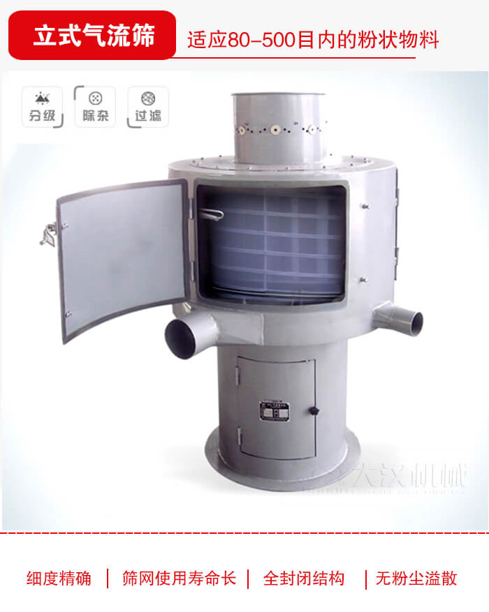氣流篩又稱(chēng)立式氣流篩主要借助風(fēng)機(jī)的風(fēng)力帶動(dòng)物料投向篩網(wǎng)從而實(shí)現(xiàn)物料的篩分,主要范圍在80-500目的粉狀物料進(jìn)行過(guò)網(wǎng),篩網(wǎng)立裝不荷重,全封閉結(jié)構(gòu),無(wú)粉塵溢散,氣流篩型號(hào)有LQS600、LQS1000、LQS1600等常規(guī)型號(hào)。